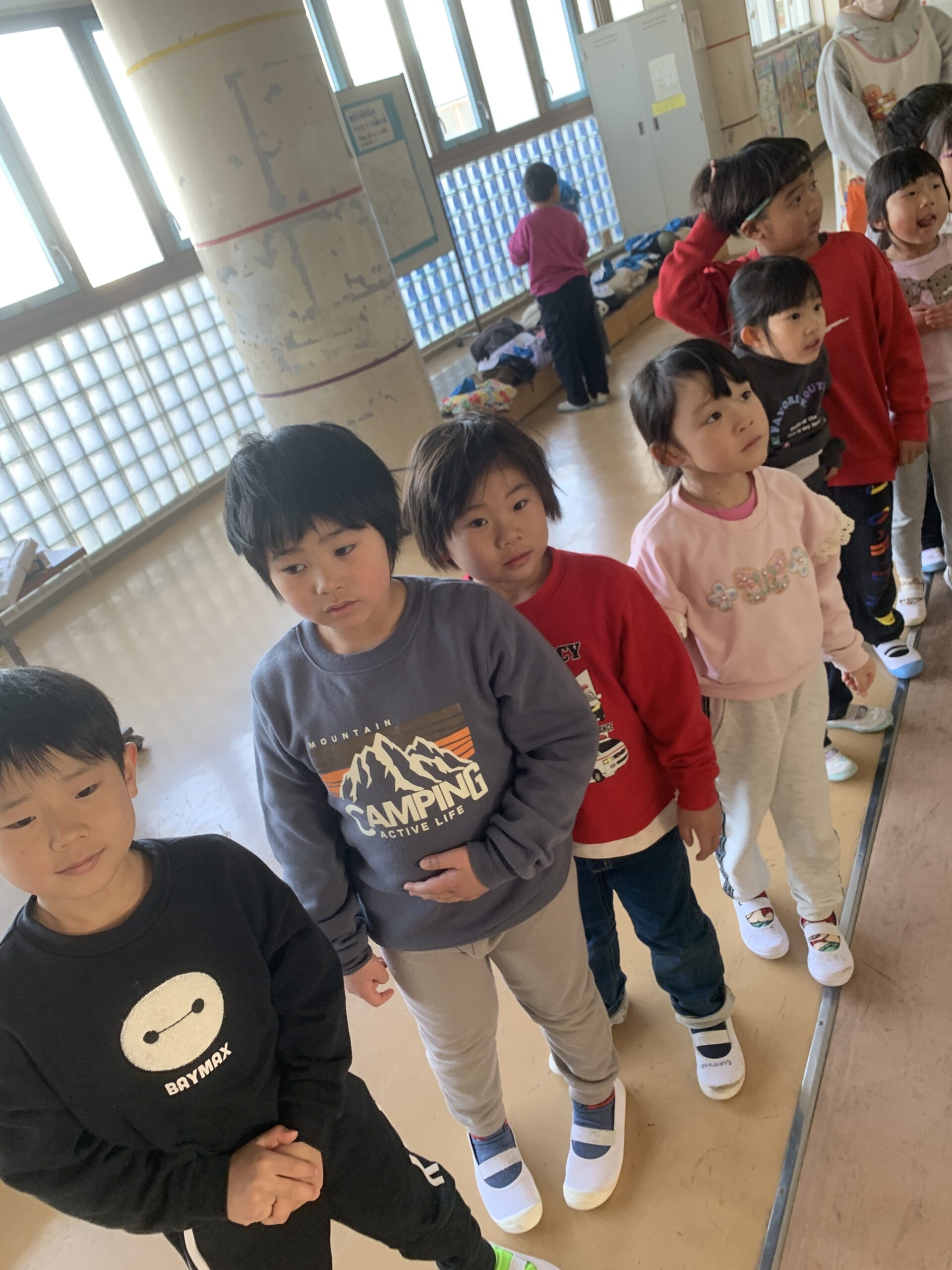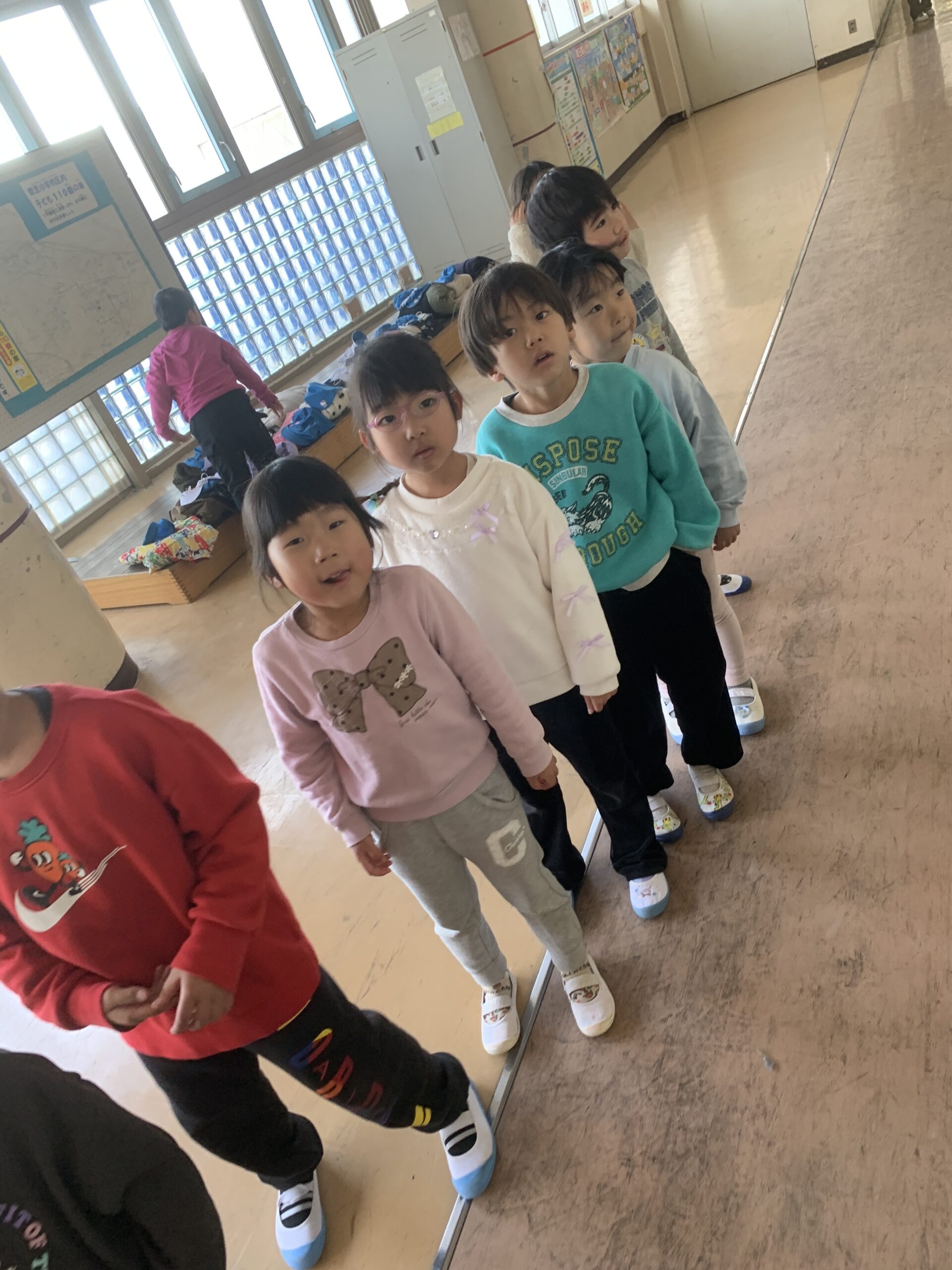 今度は給食の配膳の様子を見に行こうと目論んでいる子どもたちです🤭